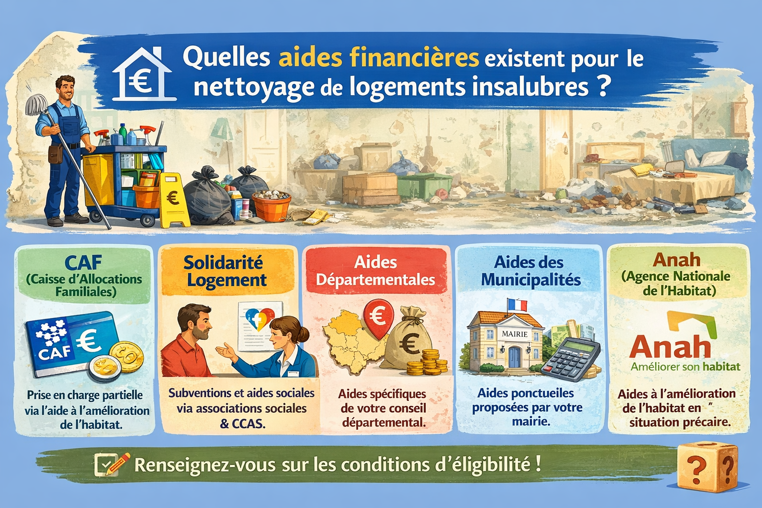 Il existe en France une mosaïque d’aides publiques, de fonds sociaux et de contributions privées qui peuvent financer tout ou partie du nettoyage d’un logement insalubre, à condition de constituer un dossier solide et de mobiliser les bons interlocuteurs. Les subventions de l’Agence nationale de l’habitat (ANAH), les secours ponctuels du Fonds de Solidarité pour le Logement (FSL), les allocations de la Caisse d’Allocations Familiales (CAF), les prêts ou avances d’Action Logement, les participations des assurances habitation et les aides des communes forment la base de ce soutien financier. À ces dispositifs s’ajoutent les interventions d’associations, de fondations et même de plateformes de microcrédit social qui complètent le financement lorsqu’il reste un reste à charge pour le ménage. Comprendre le fonctionnement de chaque aide, leurs critères d’éligibilité et la manière de les articuler entre elles est indispensable pour réussir la remise en état d’un habitat dégradé sans s’endetter lourdement.