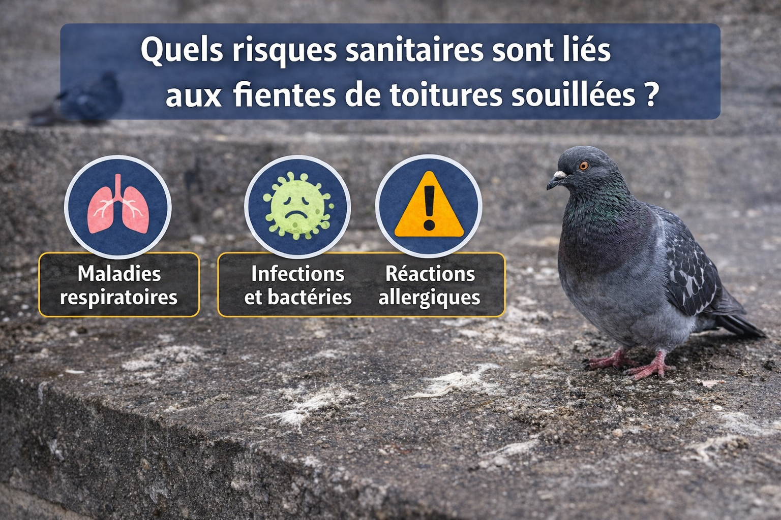 Les fientes de pigeons sont souvent perçues comme une simple nuisance esthétique sur les toitures, les balcons ou les monuments, mais elles constituent en réalité un véritable problème sanitaire pour l’homme. Ces dépôts organiques, qui s’accumulent parfois sur plusieurs centimètres dans les zones où les pigeons nichent ou s’abritent, contiennent une multitude de micro-organismes et de substances qui peuvent nuire à la santé. De nombreuses études ont montré que les fientes de pigeons abritent des bactéries, champignons et parasites, certains potentiellement graves pour les individus fragiles ou même pour une population entière en cas d’exposition répétée. À cela s’ajoutent des impacts indirects liés à la dégradation des bâtiments et au développement d’une atmosphère insalubre, notamment dans les espaces collectifs. Dans cet article, nous explorerons en profondeur les principaux risques sanitaires associés aux fientes de pigeons, les types de maladies transmissibles, les mécanismes de contamination, les populations les plus vulnérables ainsi que les bonnes pratiques pour éviter ces dangers. Cela permettra de comprendre pourquoi la gestion des volatiles en milieu urbain ne relève pas seulement d’une question de propreté mais bel et bien d’un enjeu de santé publique.